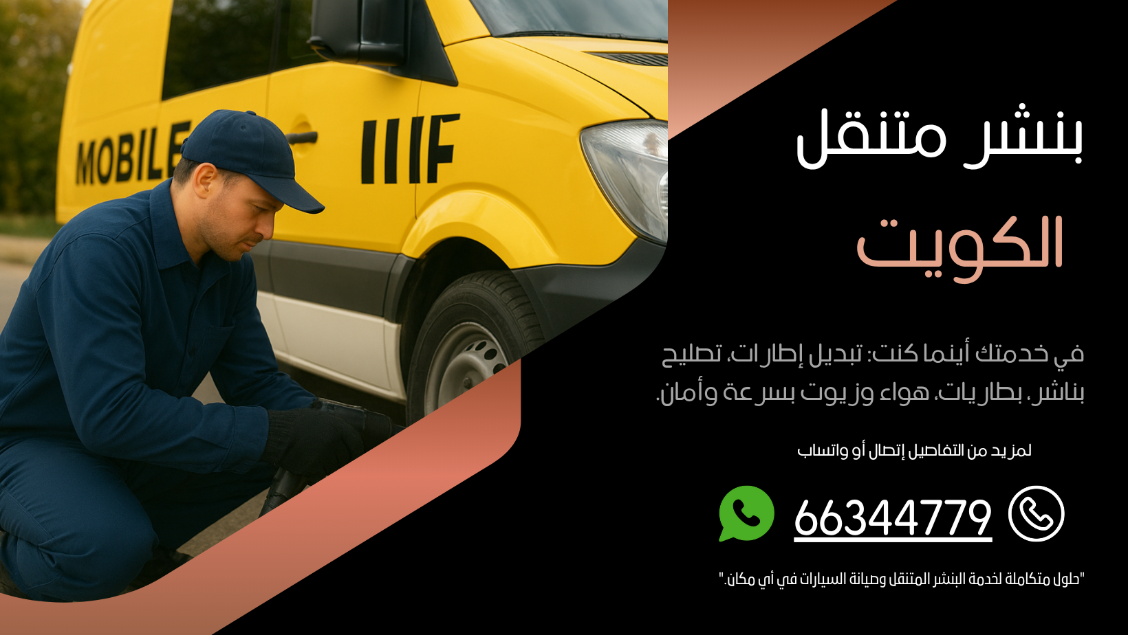 مع بنشر متنقل الكويت، تأكد أنك ستحصل على خدمة متكاملة وسريعة بأسعار منافسة وجودة تليق بثقتك بنا.