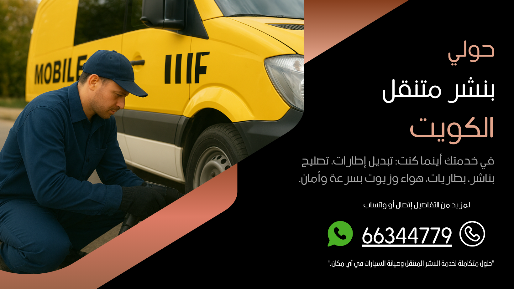 مع بنشر متنقل حولي، ستحصل على خدمة متكاملة وسريعة في أي مكان داخل الكويت، وبجودة عالية تضمن راحتك وأمانك على الطريق.