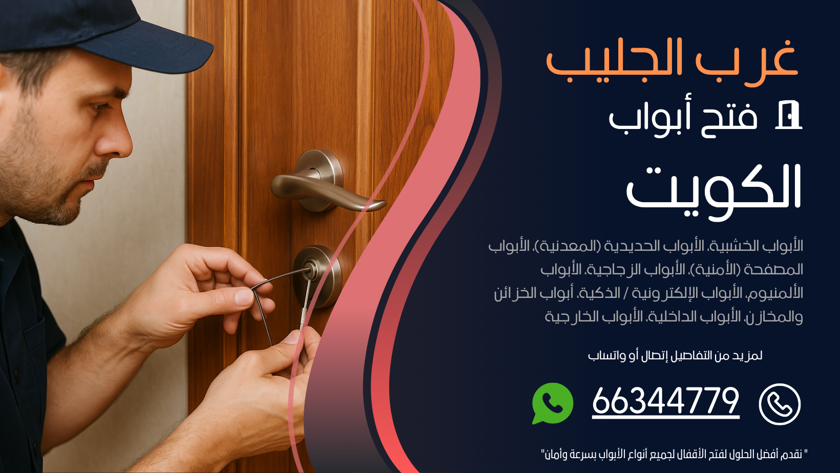 خدمة فتح ابواب منازل غرب الجليب من أهم الخدمات التي يبحث عنها سكان الكويت عند مواجهة مشكلة إغلاق الأبواب المفاجئ أو تعطل الأقفال. تقدم هذه الخدمة حلولاً سريعة وفعّالة لجميع أنواع الأبواب، سواء كانت خشبية، حديدية، أو أبواب الشقق والمنازل الحديثة. يعمل فريق متخصص ومدرب على استخدام أحدث الأدوات والتقنيات لفتح الابواب دون التسبب بأي ضرر للباب أو للمنزل، مع ضمان الحفاظ على سلامة الأقفال الأصلية قدر الإمكان.